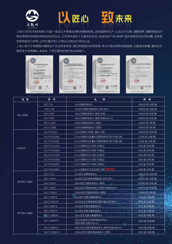 三色川(蘇州)科技有限公司是一家定位于高端生物耗材模具研發(fā)、定制型耗材生產(chǎn)、以及分子診斷、細(xì)胞培養(yǎng)、細(xì)胞免疫治療等生物相關(guān)領(lǐng)域耗材制品供應(yīng)的企業(yè)。公司有先進(jìn)的十萬(wàn)級(jí)凈化車間,全自動(dòng)生產(chǎn)線。耗材產(chǎn)品均采用無(wú)DNA/RNA酶、無(wú)熱源的醫(yī)用級(jí)進(jìn)口材質(zhì)。公司已通過(guò)ISO 13485認(rèn)證和ISO 9001認(rèn)證。